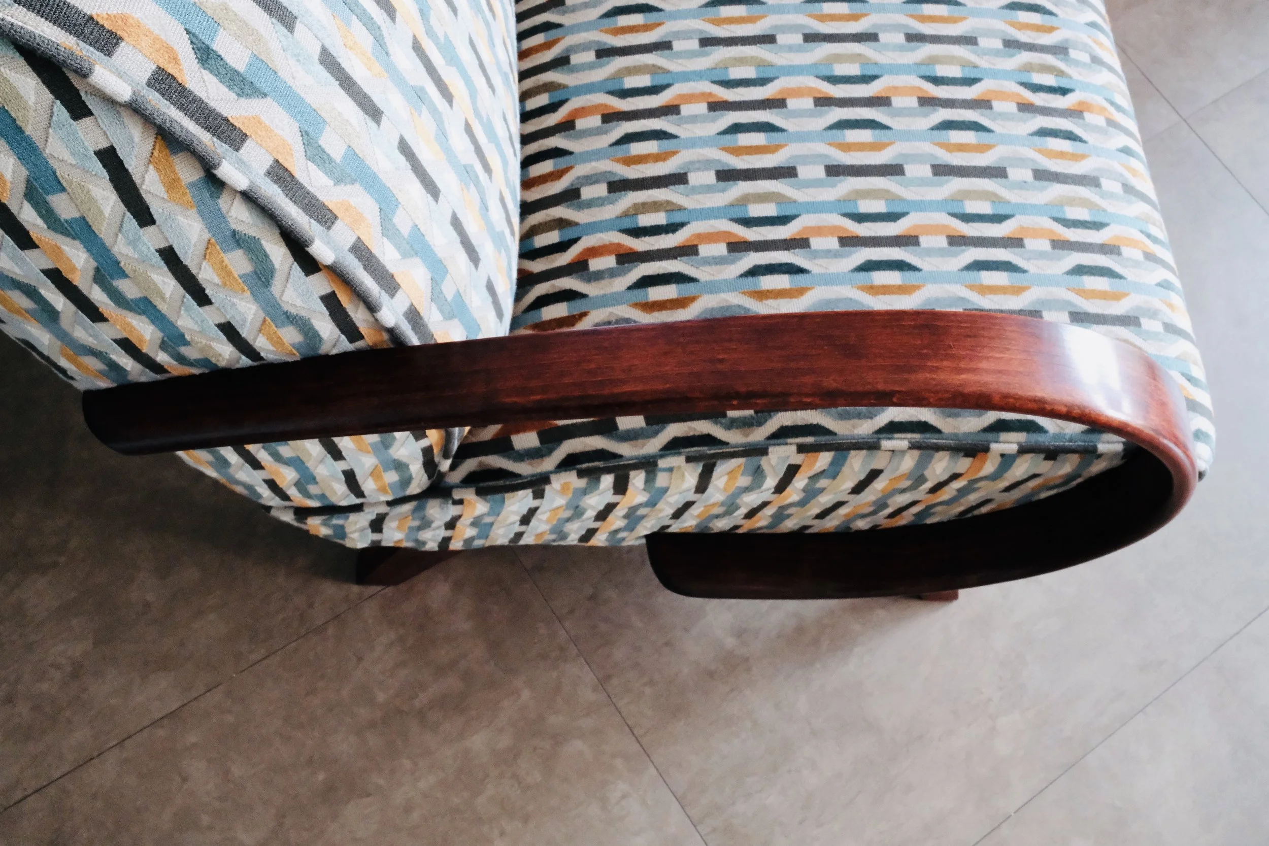 Autentické křeslo vyrobené přibližně ve 30. letech 20. století, prošlo důkladnou renovací. Dřevěné područky z ohýbaného bukového dřeva jsou původní, namořeny originálním vodou ředitelným mořidlem z 50. let v odstínu mahagon a následně ošetřeny tradiční šelakovou politurou v rubínovém tónu, která dodává dřevu hloubku a sametový lesk. Původní pružiny jsou nově vyvázány. Skladba čalounění vychází z tradičních postupů – tvoří ji africká tráva a směs kokosových vláken, které zajišťují pevnost i prodyšnost. Finální vrstvu tvoří látka od anglického výrobce ROMO z kolekce Habanera, jejíž výrazný geometrický vzor dodává křeslu současný vizuální rytmus.