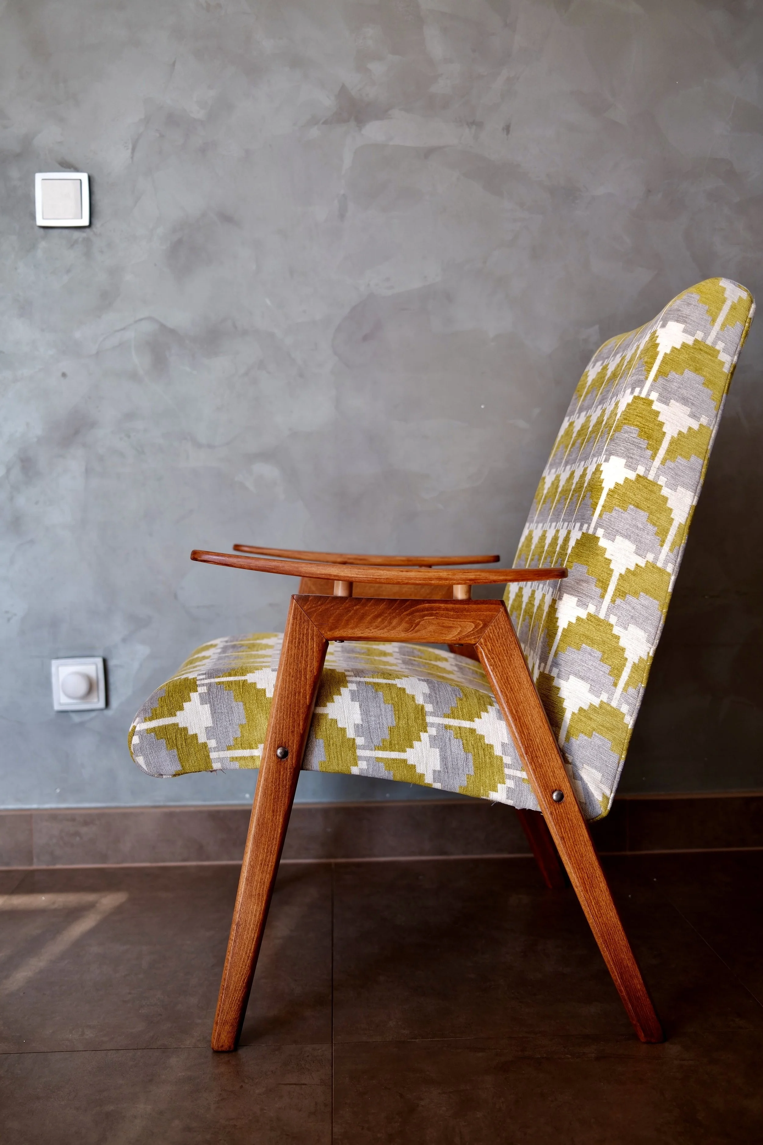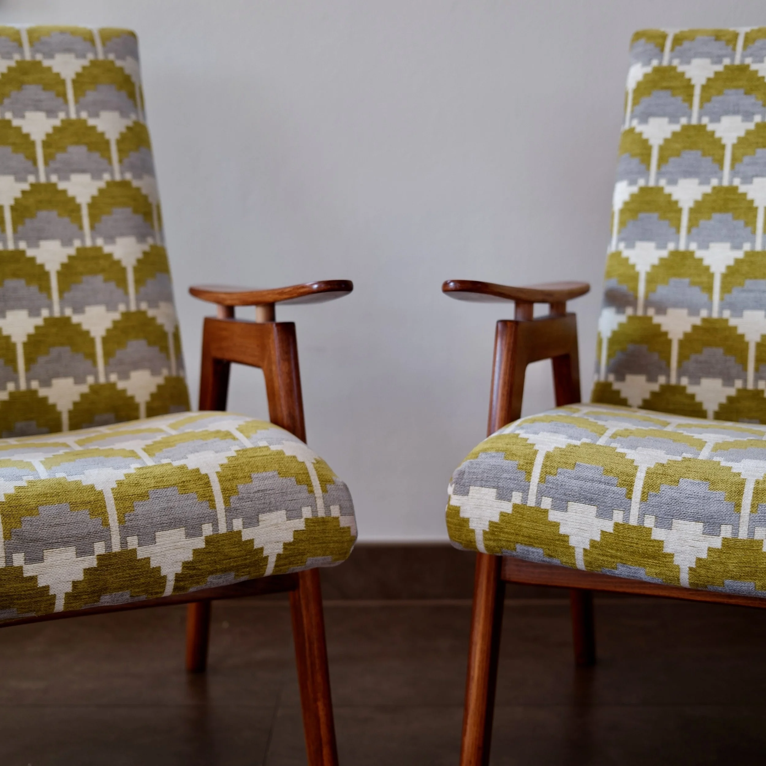 Autentická křesla navržená brněnským architektem Jaroslavem Šmídkem v 50.letech představuje elegantní spojení českého designu a současné textilní estetiky. Původní dřevěná kostra byla pečlivě repasována – pohledové části slepeny, namořeny olejovým mořidlem OSMO a následně ošetřeny lakem v hedvábném odstínu, který zvýrazňuje strukturu dřeva a dodává mu jemný lesk. Skladba čalounění je kombinací gumožíní a PUR pěny, což zajišťuje komfortní sezení a dlouhodobou životnost. Potahová látka pochází od britské značky kirbydesign ze skupiny ROMO Group – její výrazný geometrický vzor dodává křeslu současný vizuální rytmus a podtrhuje kontrast mezi historickým tvaroslovím a moderním výrazem.