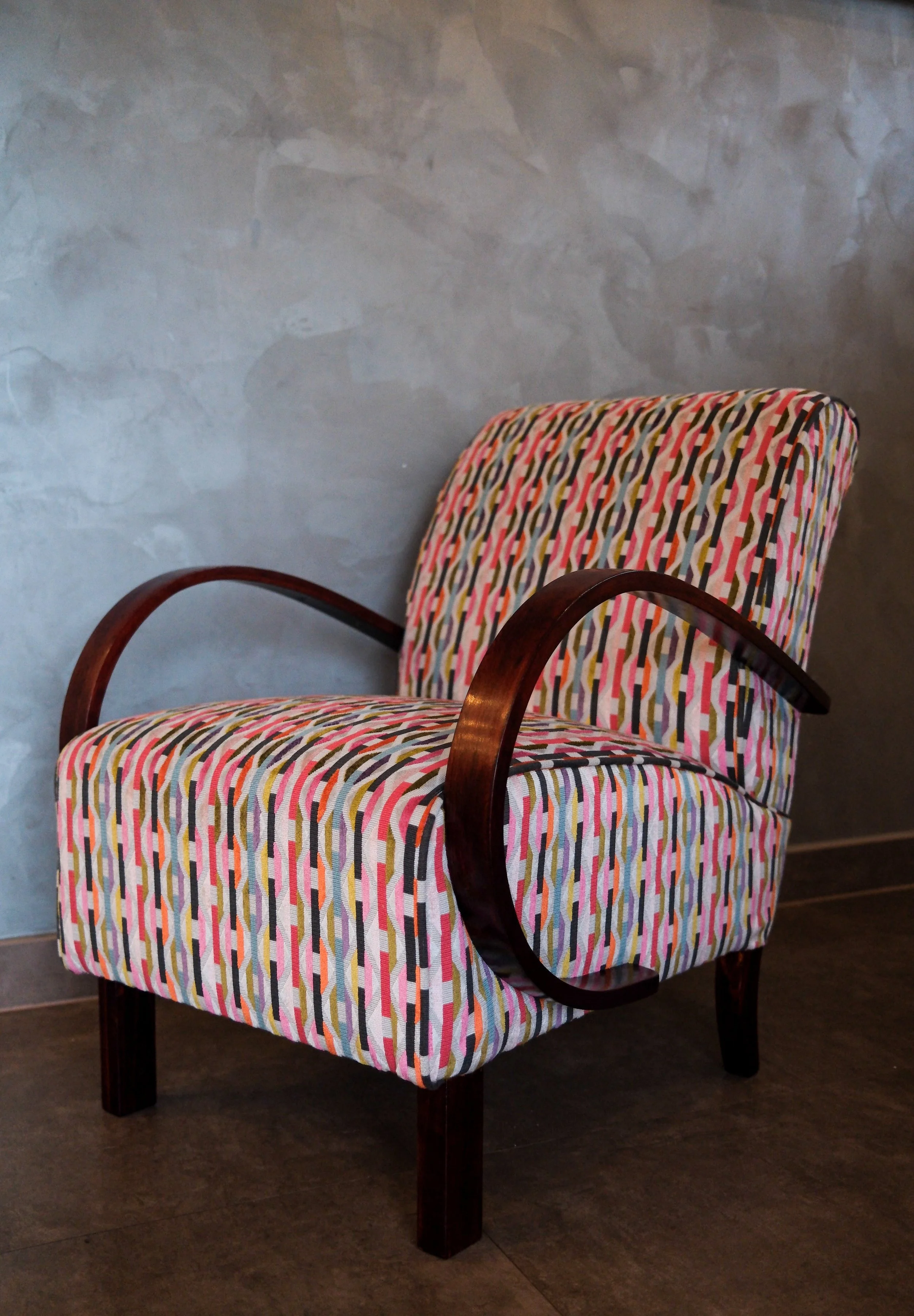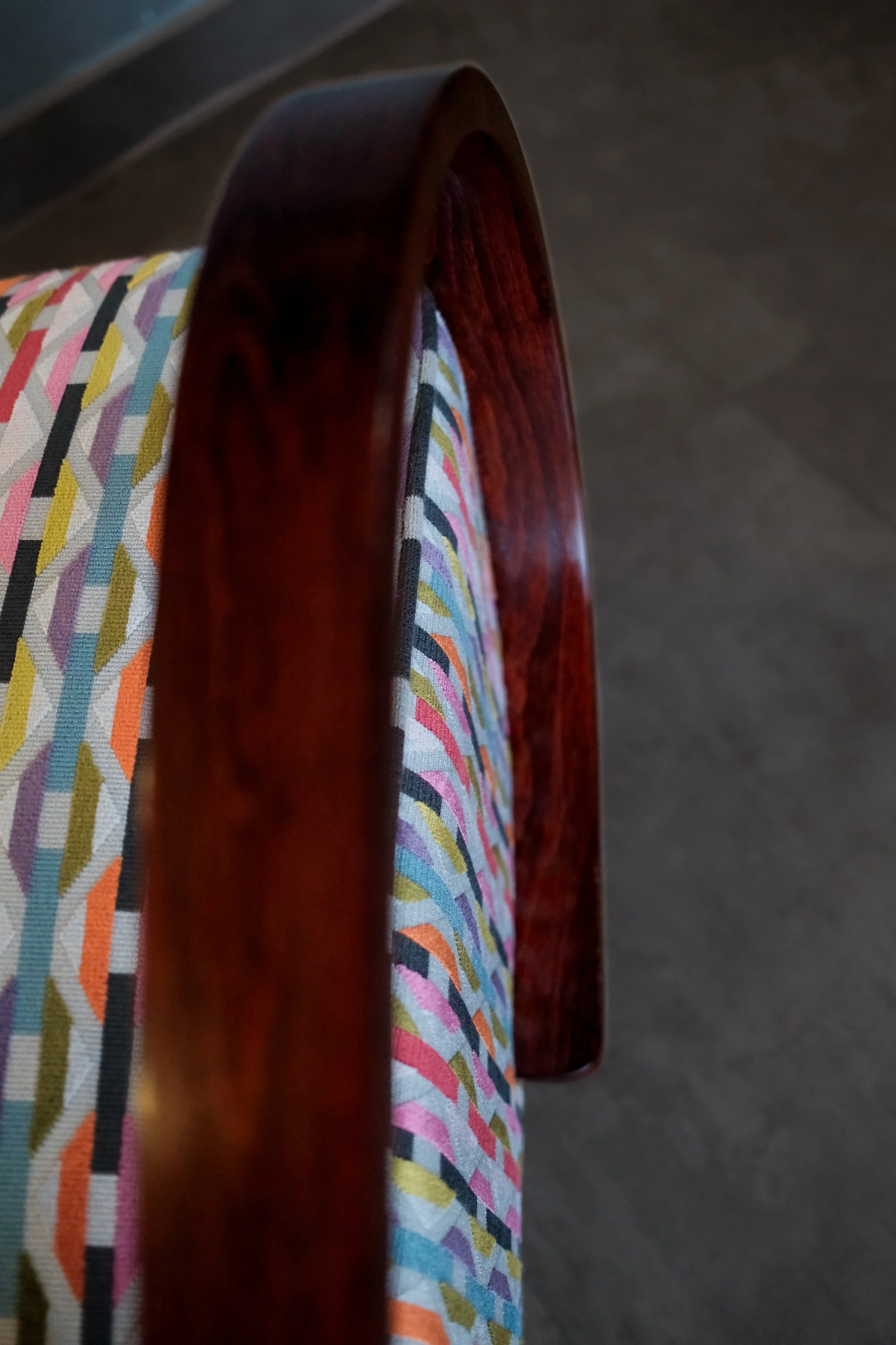 Ikonický pár křesel navržený Jindřichem Halabalou, typ C, prošel kompletní renovací s důrazem na zachování původního charakteru. Dřevěné části byly pečlivě zbroušeny a ošetřeny tradiční šelakovou politurou, která zvýrazňuje kresbu dřeva a dodává mu hedvábný lesk. Nové čalounění tvoří kvalitní anglická látka s výrazným geometrickým vzorem, který vnáší do klasického tvarosloví svěží energii. Elegantní oblouky područek zůstávají dominantním prvkem – spojení řemesla, designu a nadčasové krásy.
